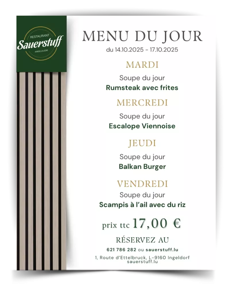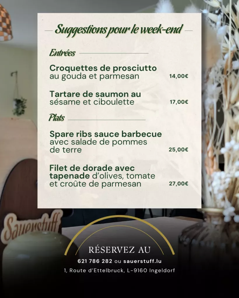 Que vous veniez pour un repas d’affaires, une soirée en amoureux ou un moment convivial en famille ou entre amis, Sauerstuff est l’endroit parfait pour partager un bon moment.